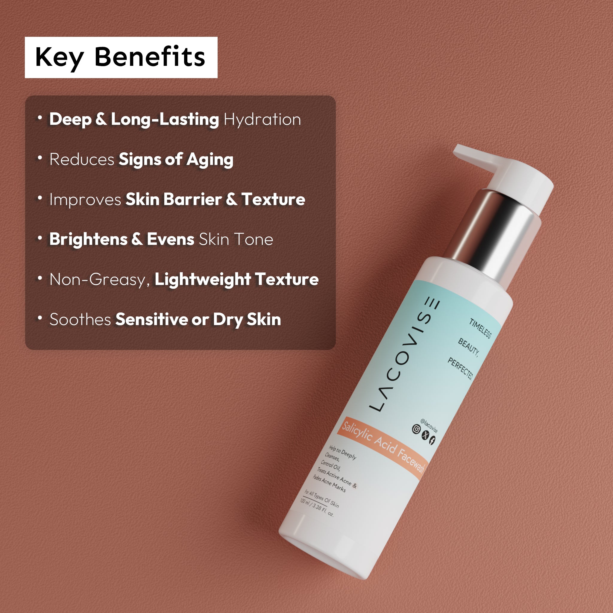 Lacovise Salicylic Acid Facewash is a deep-cleansing formula designed to combat acne, control excess oil, and fade acne marks. Powered by Salicylic Acid and DL-Panthenol, it unclogs pores, soothes active breakouts, and supports clearer, smoother skin. Ideal for oily, acne-prone, and combination skin types.
